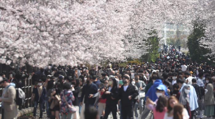 4월 첫 번째 일요일인 3일 오전 경남 창원시 진해구 경화역 공원을 찾은 상춘객이 활짝 핀 벚꽃을 구경하고 있다. 국내 대표 봄꽃 축제인 진해군항제는 코로나19로 3년째 취소됐다.