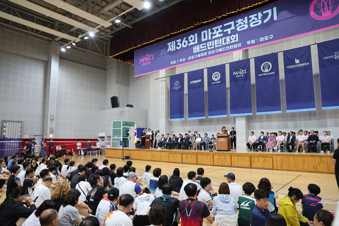 서울 마포구는 최근 마포구민체육센터에서 제36회 마포구청장기 배드민턴대회를 개최했다. 대회에는 1600여명의 선수들이 참가했으며, 남녀 단식과 복식, 3대3 복식, 혼합복식 등 다양한 종목으로 진행됐다. 사진은 박강수 구청장이 배드민턴대회에서 인사말을 하고 있는 모습. (사진=마포구청 제공)