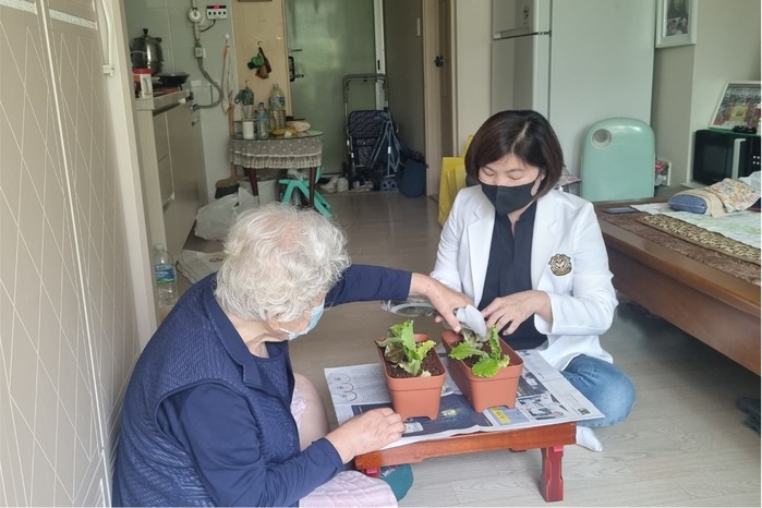 경기 하남시보건소는 코로나19로 지친 홀몸노인을 대상으로 우울 개선 및 건강증진을 위해 오는 7월까지 상추를 소재로 ‘마음속 새싹 가꾸기’ 프로그램을 운영한다. 사진은 방문간호사가 대상 노인가구를 방문해 상추 모종과 화분 세트를 전달하고 있는 모습. (사진제공=하남시청)