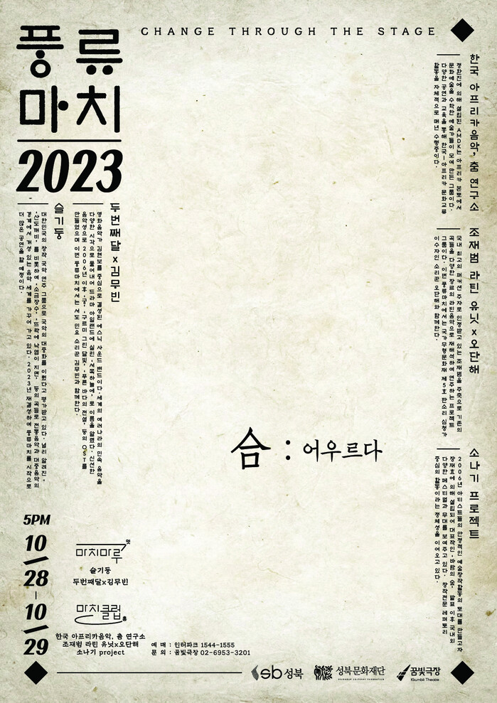 [시민일보 = 홍덕표 기자] 서울 성북구(구청장 이승로)가 오는 10월28·29일 이틀에 걸쳐 성북문화마루 꿈빛극장에서 성북문화재단 주관으로 성북 국악페스티벌 '풍류마치 2023'를 개최한다.