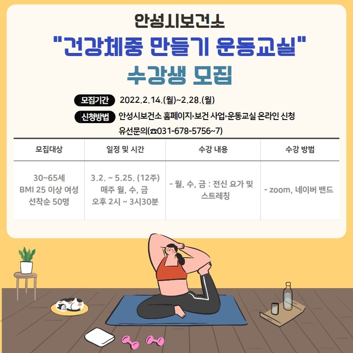 수강을 희망하는 안성 시민은 오는 2월 14일부터 28일까지 안성시보건소 홈페이지(‣보건 사업‣운동교실 온라인 신청 게시판)에서 신청하거나 안성시보건소 건강증진센터로 전화신청하면 된다.