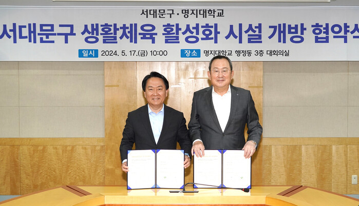[시민일보 = 변은선 기자] 서울 서대문구(구청장 이성헌)와 명지대학교가 최근 명지대학교 행정동에서 생활체육 활성화를 위한 학교 체육시설 개방 협약을 체결했다.