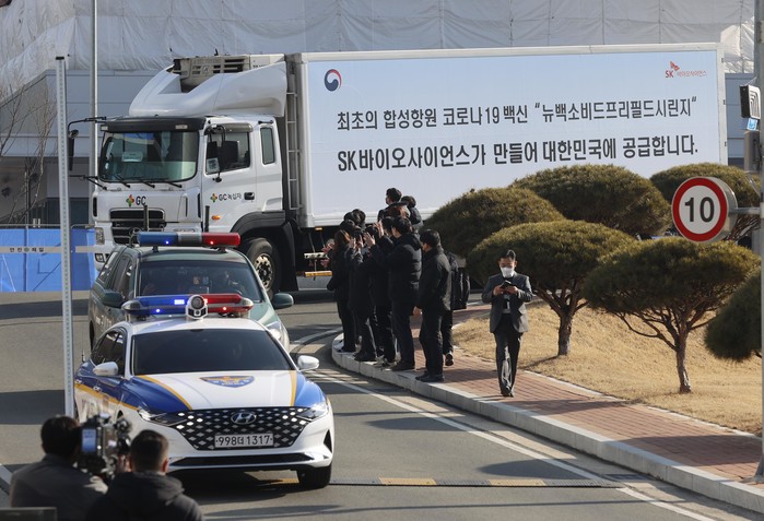 9일 오전 경북 안동시 SK바이오사이언스에서 출하된 코로나19 노바백스 백신이 수송차량에 실려 이동하고 있다. SK바이오사이언스는 이날 노바백스 백신 29만2천회분을 출하했으며, 이달 중 약 200만회분을 내놓을 예정이다. 또 정부의 예방 접종계획 등을 고려해 이후에도 순차적으로 백신을 공급할 예정이다. (사진제공=연합뉴스)