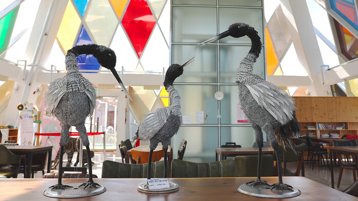 이번 전시된 작품은 대표 철새인 두루미를 시작으로 부엉이, 호랑이 등 서산버드랜드에 어울리는 동물 작품 30점이며 음료수 캔, 철 수세미, 찜기 등으로 제작됐다.