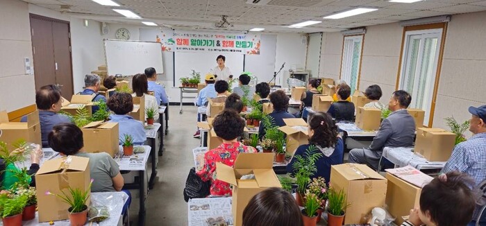 반려식물 만들기 프로그램은 1인 가구 대상자와 동 지역사회보장협의체 위원 30여 명이 참여했으며, 자신만의 화분을 완성하는 작업을 통해 서로를 알아가고, 심리적 거리감을 해소했다.