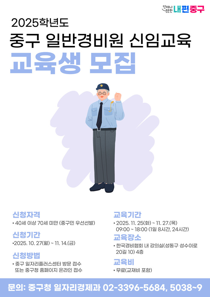[시민일보 = 여영준 기자] 서울 중구가 법정의무교육 이수부터 취업연계까지 원스톱으로 지원하는 실무 중심의 <일반경비원 신임교육 과정>을 무료로 운영한다.