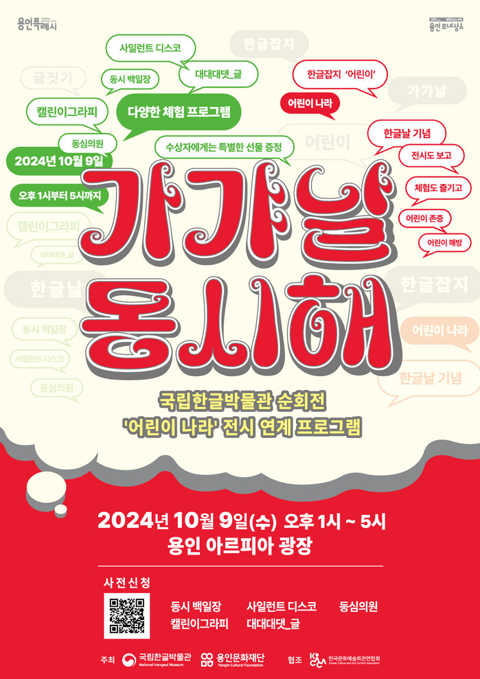 10월 9일 한글날을 맞이하여 국립한글박물관 순회 전시 ‘어린이 나라’의 연계 프로그램으로 ‘가갸날 동시해’를 운영한다. 이번 프로그램은 창의적 질문과 대답으로 이어나가는 참여형 전시인 ‘대대다_댓글’, 동심을 담은 다양한 단어나 문장을 수집하는 캘리그라피인 ‘캘린이그라피’, 어린이가 직접 처방하는 동심 상담소 ‘동심의원’, 소음 걱정 없이 자유롭게 춤추는 디스코 파티인 ‘사일런트 디스코’, 즉흥적인 시제에 따라 짓는 N행시 백일장 대회인 ‘동시 백일장’ 등이 진행된다.
