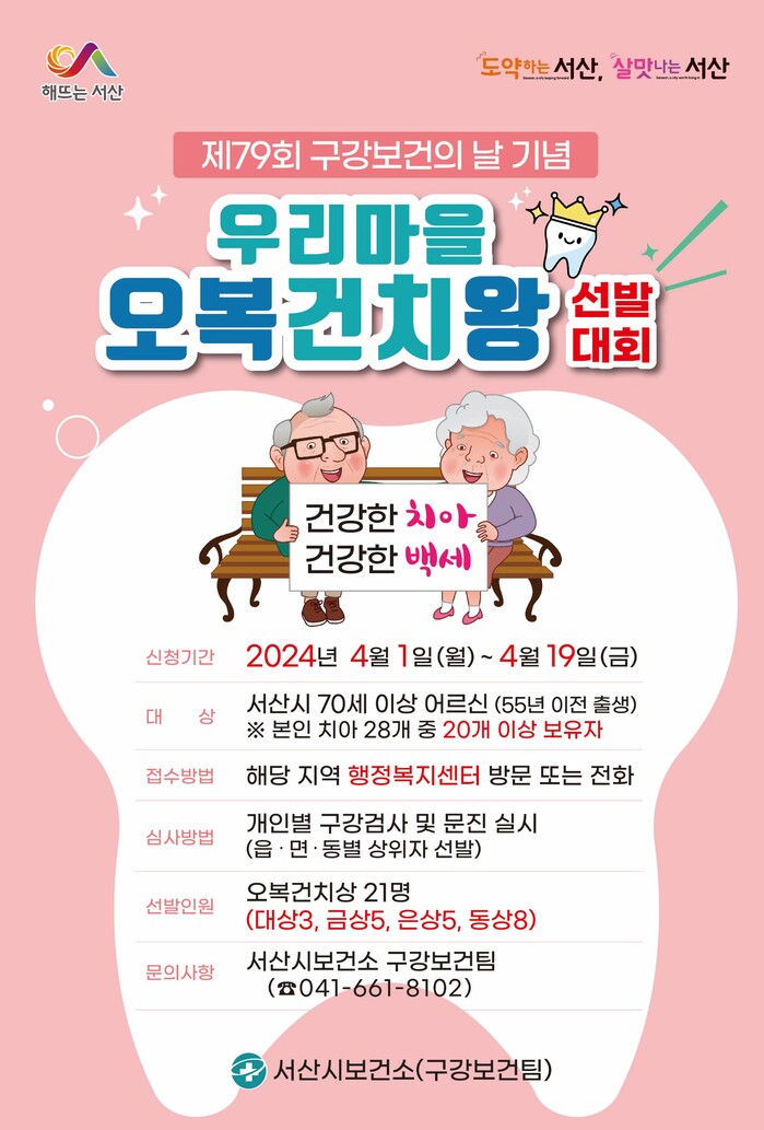 대회 접수는 70세 이상 서산시민이면서 20개 이상의 건강한 치아를 잘 보존하고 있는 경우 누구나 신청할 수 있다.