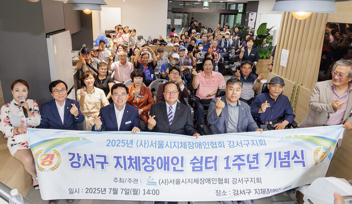 진교훈 서울 강서구청장이 7일 지체장애인 쉼터 개소 1주년 기념행사에 참석해 장애인 복지 증진을 강조했다. 사진은 진 구청장이 행사 참석자들과 기념 촬영을 하는 모습. (사진=강서구청 제공)
