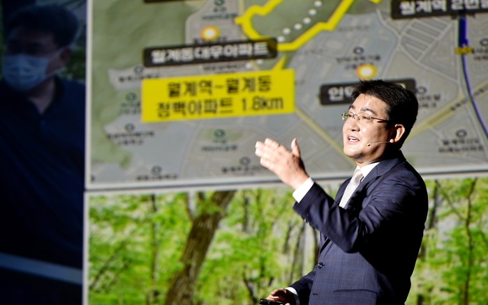 오승록 서울 노원구청장은 지난 8일 ‘노원의 내일은 기대됩니다’, ‘노원의 오늘은 행복합니다’라는 주제로 민선8기 비전선포식을 개최했다. 사진은 이날 오 구청장이 구정운영 방향과 주요 정책을 프레젠테이션하고 있는 모습. (사진제공=노원구청)
