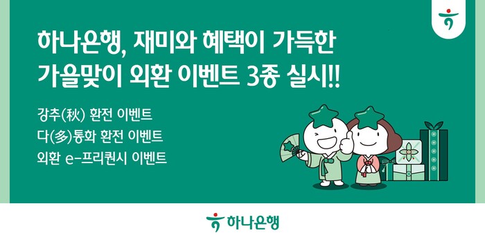 [시민일보 = 여영준 기자] 하나은행은 가을을 맞아 해외여행을 위한 환전·송금 등 다양한 외환서비스를 이용하는 손님들을 대상으로 재미와 혜택이 가득한 외환 이벤트 3종을 실시한다고 3일 밝혔다.