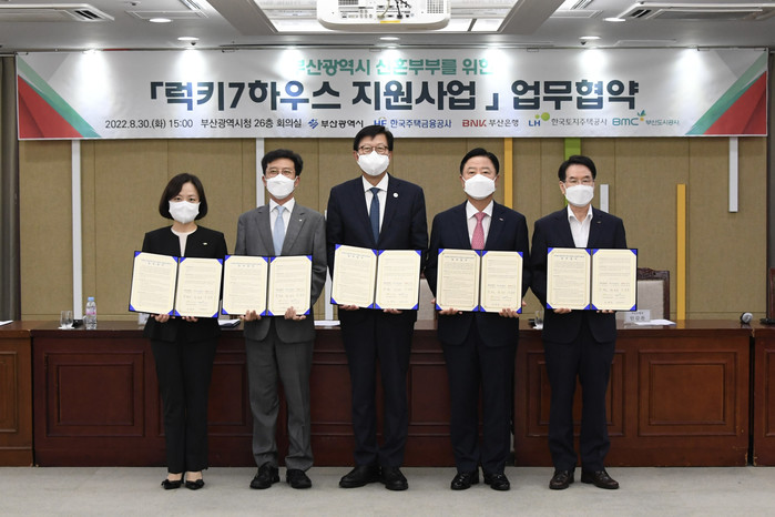 [시민일보 = 여영준 기자] BNK부산은행은 30일 오후, 부산시청에서 부산광역시, 한국주택금융공사, 한국토지주택공사, 부산도시공사와 공동으로 ‘부산시 신혼부부 럭키7 하우스 지원 사업’ 업무협약을 체결했다고 밝혔다.