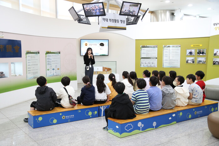 [성남=오왕석 기자] 왕남초등학교 4학년 어린이들이 16일 오전 성남시의회 홍보관을 견학했다. 방문한 어린이들은 강상태 의원의 환영 인사를 받았다.