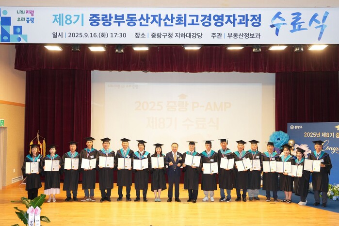 서울 중랑구가 최근 구청 지하대강당에서 ‘중랑부동산자산최고경영자과정’ 제8기 수료식을 개최했다. 이번 수료식에는 수강생과 내빈 등 200여명이 참석해 6개월간의 교육 과정을 마무리하는 뜻깊은 시간을 보냈다. 사진은 류경기 구청장이 참석자들과 기념촬영을 하고 있는 모습. (사진=중랑구청 제공)