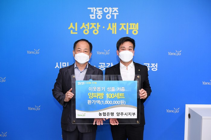 경기 양주시는 지난 25일 농협 양주시지부로부터 코로나19 장기화로 인한 양파 가격 하락으로 어려움을 겪고 있는 양파 재배 농가를 돕고 어려운 이웃에게 달콤한 양파빵을 선물하기 위한 양파빵 100세트를 전달받았다. 사진은 전달식에서 김종석 시장 권한대행(왼쪽)과 관계자가 기념촬영을 하고 있는 모습.(사진제공=양주시청)