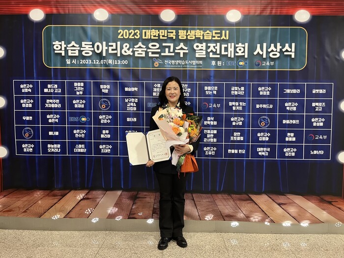 [시민일보 = 이대우 기자] 최근 EBS 스페이스홀에서 열린 ‘2023 대한민국 평생학습도시 학습동아리&숨은고수 열전대회’ 시상식에서 숨은고수 부문에서 서울 강남구(구청장 조성명) 강남애(愛) 미래 문해교실 프로그램의 조유진 강사가 장려상을 수상했다.