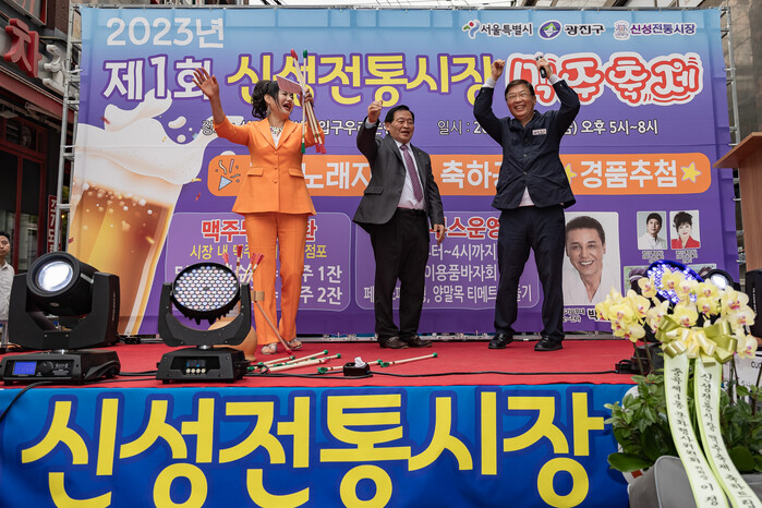 서울 광진구 신성전통시장에서 최근 가을 맥주의 시원함을 선사하는 ‘비어(Beer) 축제’가 개최됐다. 사진은 축제 준비에 힘써준 신성전통시장 상인회와 구민에게 감사를 전하는 김경호 구청장(오른쪽)의 모습. (사진=광진구청 제공)