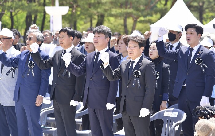 | ▲ 강기정 광주광역시장이 17일 오전 북구 운정동 국립5·18민주묘지에서 열린 '제43주년 5·18민주화운동 추모제'에 참석해 문금주 전남행정부지사, 정홍식 광주지방보훈청장, 유가족 등과 님을 위한 행진곡을 제창하고 있다./광주광역시 제공 |