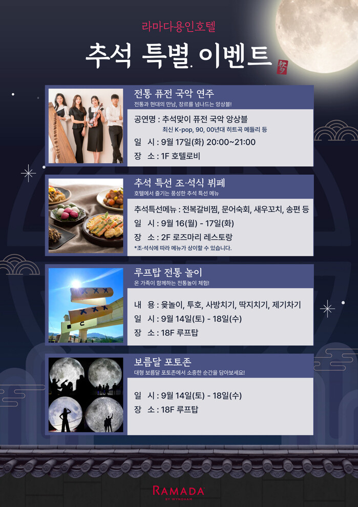 라마다용인호텔 관계자는 “추석을 맞이해 온 가족 모두가 즐길 수 있는 다양한 이벤트를 준비했다”며 “추석 연휴 라마다용인호텔에서 소중한 순간을 남기고, 추석의 풍요로움을 즐기시길 바란다”라고 전했다.