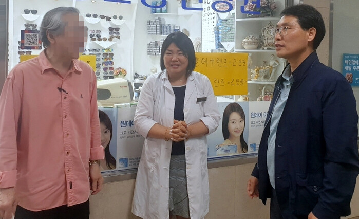 | ▲ 서대문구 충현동의 한 안경사가 자신의 매장 밖에 쓰러져 있던 기초수급 홀몸노인을 구해 주위에 귀감이 되고 있다. 사진은 건강을 회복한 노인(왼쪽)과 이동완 충현동장(오른쪽)이 김민영 안경사를 찾아 감사의 뜻을 전하고 있는 모습. (사진=서대문구청 제공) |