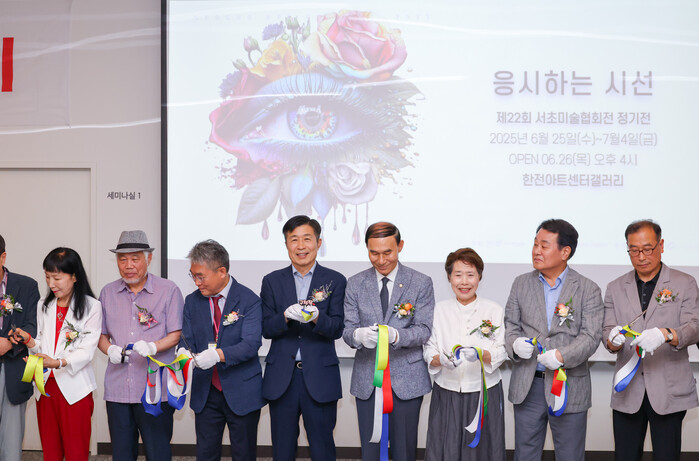 전성수 서울 서초구청장이 최근 서초미술협회전 운영위원회가 주관하는 '제22회 서초미술협회 정기회원전'에 참석해 작가들을 격려했다. 사진은 전 구청장(오른쪽 다섯 번째)이 관계자들과 테이프 커팅을 하는 모습. (사진=서초구청 제공)