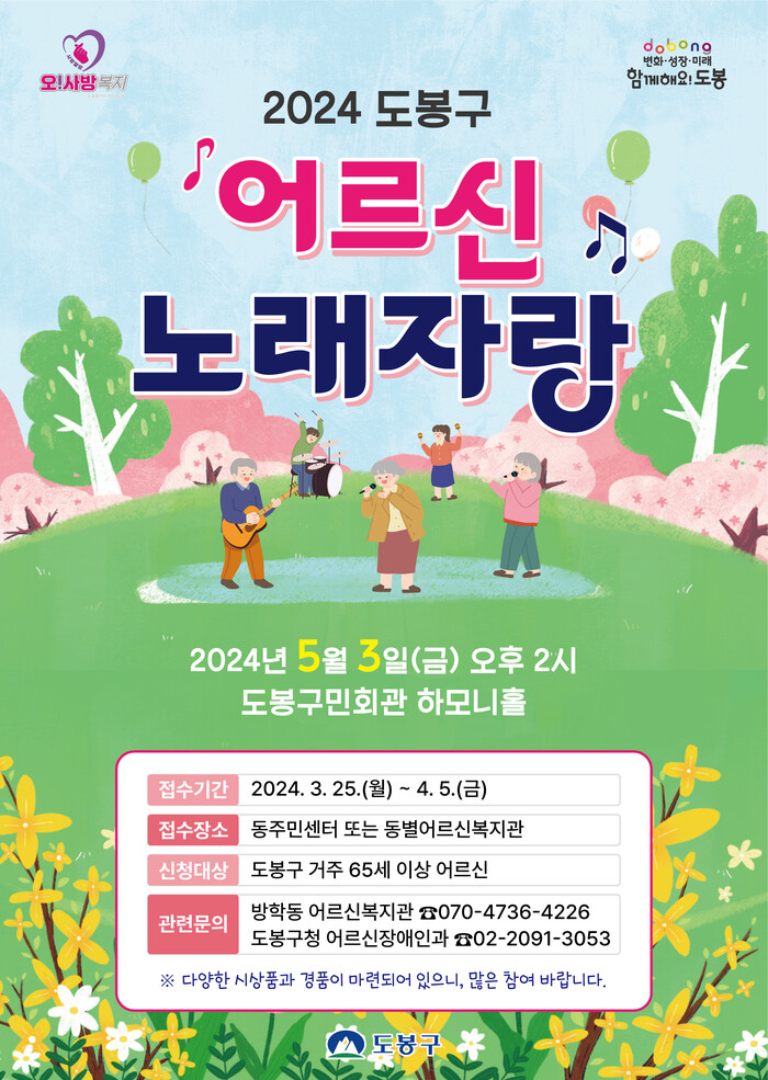 [시민일보 = 여영준 기자] 서울 도봉구(구청장 오언석)는 오는 5월3일 오후 2시 도봉구민회관 하모니홀에서 2024년 '어르신 노래자랑'을 개최한다고 밝혔다.