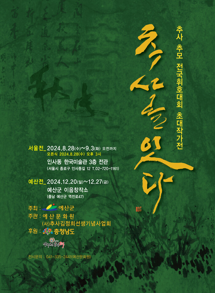 [예산=김의석 기자] 충남 예산군은 예산문화원과 (사)추사김정희선생기념사업회에서 공동으로 주관하는 추사추모전국초대작가전 ‘추사를 잇다’가 오는 28일부터 9월3일까지 서울 인사동 문화예술의 중심지인 한국미술관 3층 전관에서 열린다고 밝혔다.