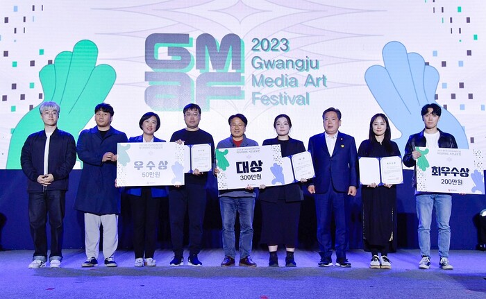 | ▲ 강기정 광주광역시장(가운데)이 12일 오후 남구 광주미디어아트플랫폼 G.MAP에서 열린 '2023 광주미디어아트페스티벌' 개막식에 참석해 김병내 남구청장, 신수정 시의원과 시민공모전 수상자들에게 시상을 한 뒤 기념촬영을 하고 있다./광주광역시 제공 |