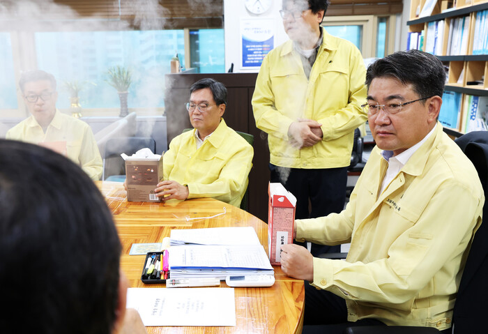 오승록 서울 노원구청장이 최근 종합상황실에서 발령된 을지연습 비상소집 훈련에 참여해 상황을 직접 점검했다. 이번 훈련은 비상사태 발생 시 신속한 대응체계를 구축하고 공무원의 위기 대응 역량을 강화하기 위해 추진됐다. 사진은 오 구청장(오른쪽)이 국장단과 함께 전투식량을 체험하는 모습. (사진=노원구청 제공)