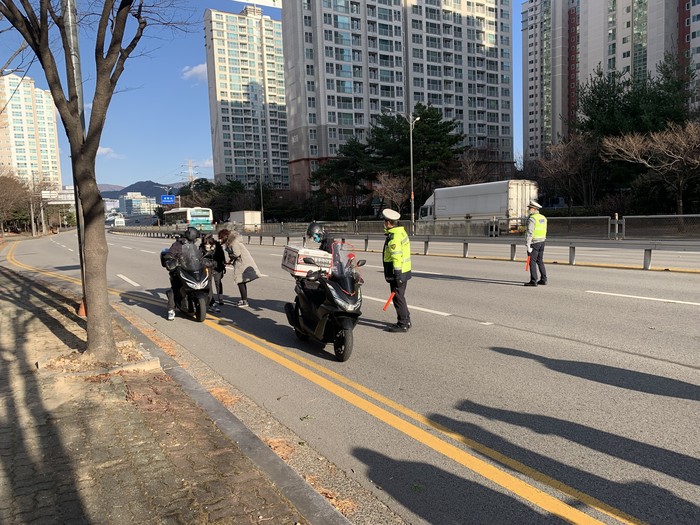 양산경찰서(서장 정성학)는 지난 17일(금) e편한세상 2차 아파트 앞 교차로에서 경남청 암행순찰팀·물금지구대·양산시청 교통과와 함께 이륜차의 교통법규위반 행위 및 안전기준위반 행위에 대해 집중 단속을 펼쳤다.