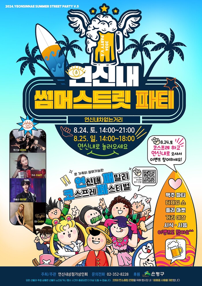 이번 연신내 썸머스트릿 파티는 ▲맥주 이벤트 부스 ▲핫썸머! 뮤직 공연무대 ▲거리야장 먹거리 부스 ▲플리마켓 부스 ▲코스프레 대회 ▲거리노래방 ▲포토존 운영 등 여름의 끝자락을 즐길 수 있는 다양한 문화 콘텐츠와 체험 이벤트가 준비되며, 운영 시간은 오는 24일 오후 2~9시, 25일에는 오후 2~6시다.