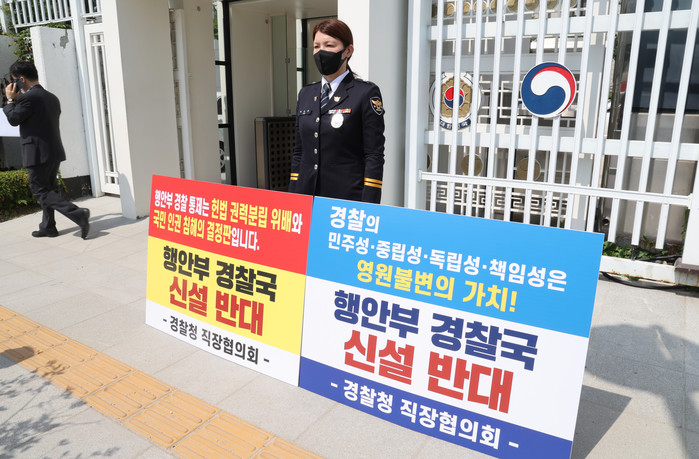 이소진 경찰청 직장협의회장이 21일 정부서울청사 앞에서 행안부 경찰국 신설 반대 일인시위를 하고 있다.