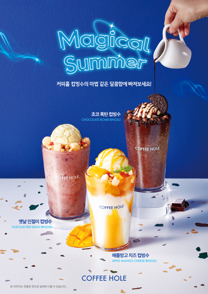 이번 출시한 커피홀의 1인 빙수는 ▲깊고 진한 초콜릿의 풍미를 느낄 수 있는 초코 빙수 위에 달콤 바삭한 초코볼, 쿠키 토핑을 더한 ‘초코 폭탄 컵빙수’ ▲상큼, 새콤한 애플망고와 고소한 그래놀라, 쫀득한 치즈 토핑이 조화를 이루는 ‘애플망고 치즈 컵빙수’ ▲100% 국내산 팥, 고소한 인절미로 만들어진 건강한 팥빙수와 그래놀라 시리얼, 아이스크림이 완벽한 조화를 이루는 ‘옛날 인절미 컵빙수’ 총 3종으로 구성됐다.
