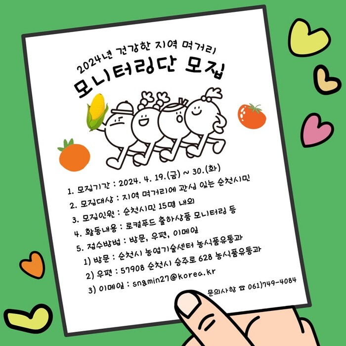 건강한 지역 먹거리 모니터링단 참여는 시 홈페이지 및 시 SNS(밴드ㆍ블로그)에서 신청서를 다운로드 후 작성해 방문, 우편 및 이메일 발송을 통해 가능하다.