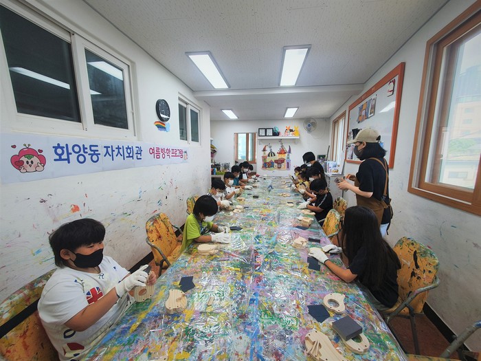 광진구 화양동 주민센터는 최근 서울동화센터에서 자치회관 여름방학 프로그램으로 ‘뚝딱! 우드스피커 만들기’를 진행했다. 이날 총 15명의 초등학생들은 소나무 원목을 가공하고 조립해 무동력으로 소리를 증폭시키는 스피커를 만들었다. 사진은 참여자들이 우드스피커를 만들고 있는 모습. (사진제공=광진구청)
