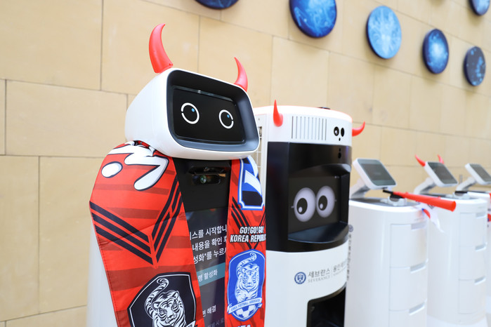 대한민국의 카타르 월드컵 조별 예선 첫 경기를 맞아 용인세브란스병원 가이드로봇과 5G 복합 방역로봇 등 의료서비스로봇이 국가대표팀의 선전을 기원하며 응원을 펼치고 있다.