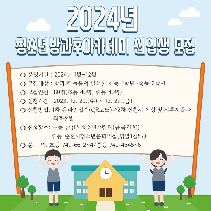 [순천=이문석 기자] 전남 순천시가 오는 20일부터 29일까지 '2024년 청소년방과후아카데미' 신입생 80명을 모집한다.