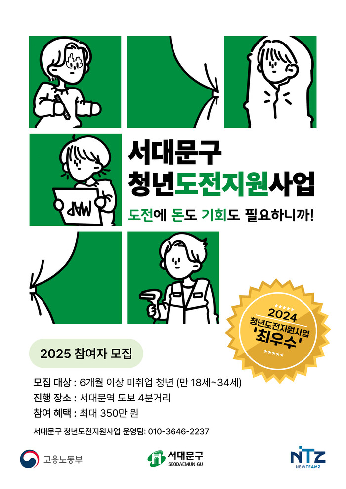 [시민일보 = 이대우 기자] 서대문구(구청장 이성헌)는 구직 청년들이 도전과 경험을 통해 성장할 수 있도록 ‘2025년 청년도전지원사업’ 참여자를 상시 모집한다고 12일 밝혔다.