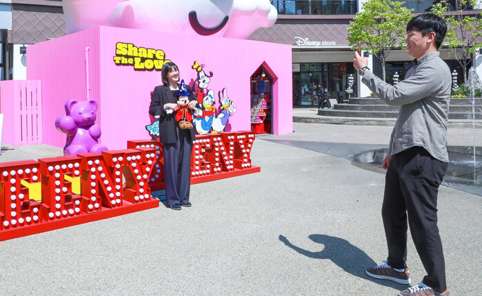 | ▲ 1일 오전, 현대프리미엄아울렛 김포점의 미키마우스와 친구들로 꾸며진 연출물 앞에서 고객들이 기념사진을 찍고 있다. (사진=현대백화점 제공) |