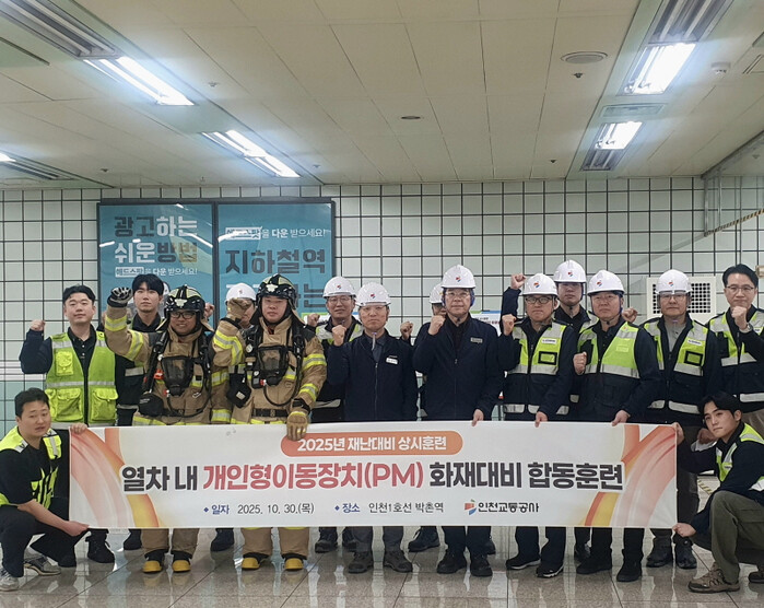 훈련은 인천교통공사와 인천메트로서비스, 계양소방서 등 유관기관이 참여, 사회적으로 이슈가 되고 있는 열차 내 개인형이동장치(PM) 배터리 화재 사고에 체계적으로 대응하기 위한 실전형 합동훈련으로 진행됐다.