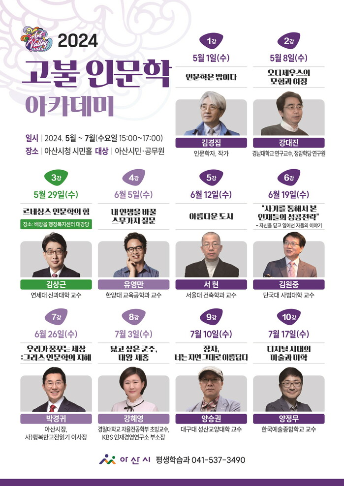 [아산=박명수 기자] 충남 아산시가 오는 5월1일 시청 시민홀에서 김경집 작가의 ‘인문학은 밥이다’를 주제로 ‘2024 고불 인문학 아카데미’ 첫 번째 이야기를 시작한다.