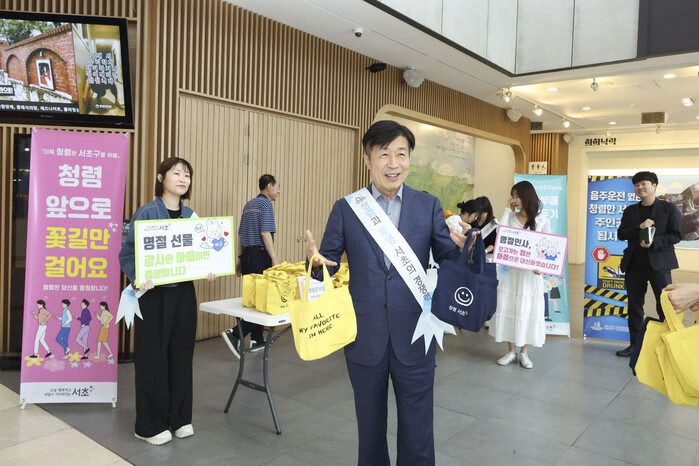 서울 서초구가 추석명절 부패취약 기간 동안 청렴주의보를 발령하고 지난 23일 구청 본청과 보건소 일대에서 ‘청렴서초 캠페인’을 실시했다. 사진은 전성수 구청장(가운데)과 구 관계자들이 캠페인’에 참여하는 모습. (사진=서초구청 제공)