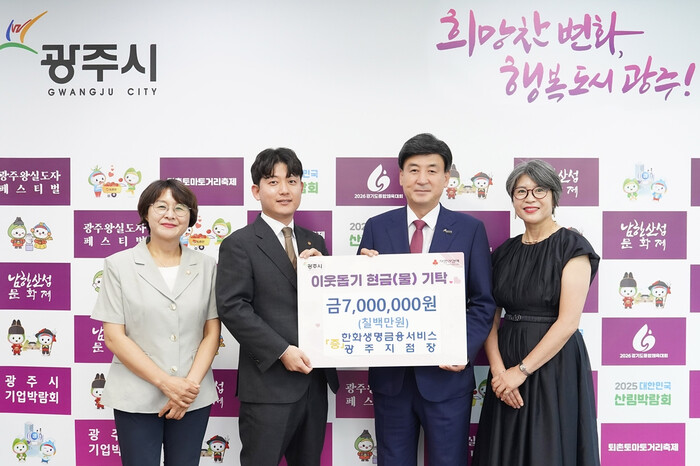 경기 광주시가 최근 한화생명금융서비스 광주지점로부터 지역내 어려운 이웃들을 위한 성금 700만원을 기탁받았다. 사진은 기탁식에서 방세환 시장(오른쪽 두 번째)이 관계자들과 기념 촬영을 하는 모습. (사진=광주시청 제공)