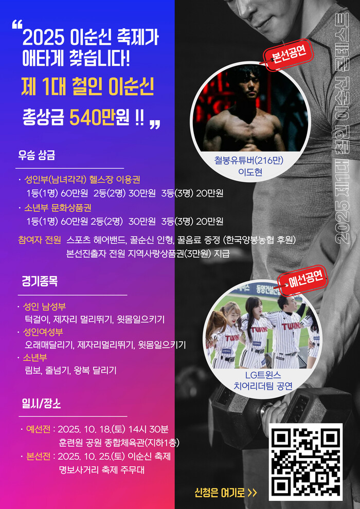 본선은 오는 25일 ‘2025 이순신 축제’에서 펼쳐진다. 본선은 한 종목으로 승부를 가른다. 성인 남성부는 턱걸이, 성인 여성부는 오래매달리기, 소년부는 줄넘기로 최종 우승자를 결정한다.