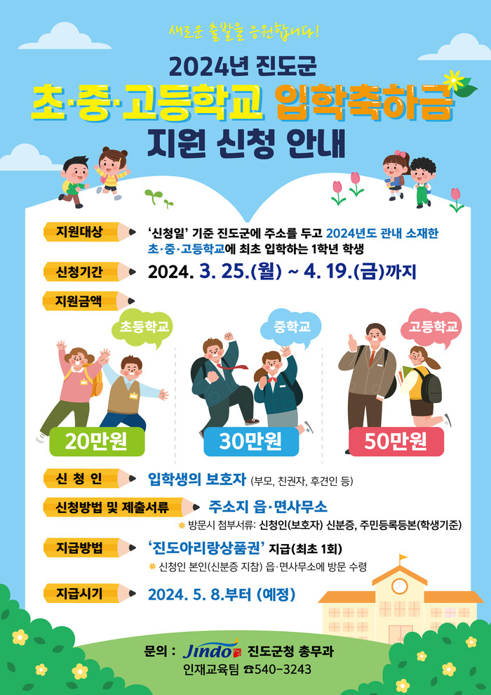 신청은 입학생의 보호자인 부모, 친권자, 후견인 등이고 오는 19일까지 주소지의 읍ㆍ면사무소를 방문해 필요한 서류와 함께 신청하면 군은 지급대상자를 확정해 어버이날인 5월8일부터 ‘진도아리랑상품권’으로 입학축하금을 지급할 계획이다.