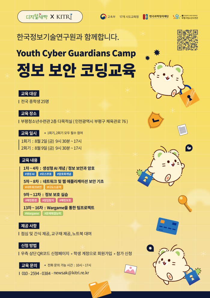 생성형 인공지능(AI)의 개념, 정보 보안과 암호, 네트워크 및 웹 애플리케이션 보안 등 사이버 보안 환경을 이해하고 해킹과 보안 방어를 모의 체험할 수 있는 교육으로 진행될 예정이다.