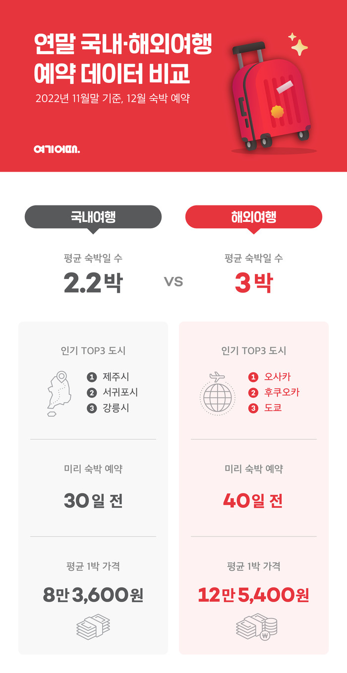 대한민국 대표 종합 여행·여가 플랫폼 여기어때가 12월 국내 및 해외 숙박 예약 데이터를 분석해 본 결과, 평균 숙박일 수를 비롯해 전반의 여행 패턴이 큰 차이를 보이지 않는 것으로 나타났다.
