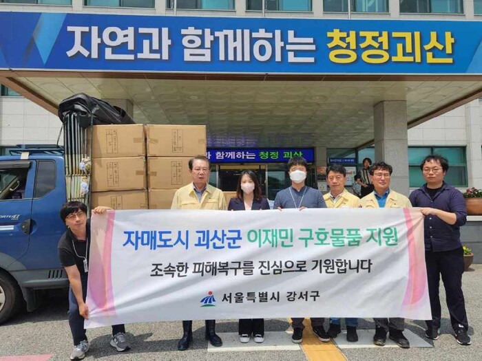 서울 강서구가 지난 20일 폭우로 피해를 입은 자매도시 충북 괴산군청을 찾아 수건·담요 등으로 구성된 긴급 구호세트 600개를 직접 전달했다. 사진은 이날 전달식에서 관계자들이 기념촬영을 하고 있는 모습. (사진=강서구청 제공)