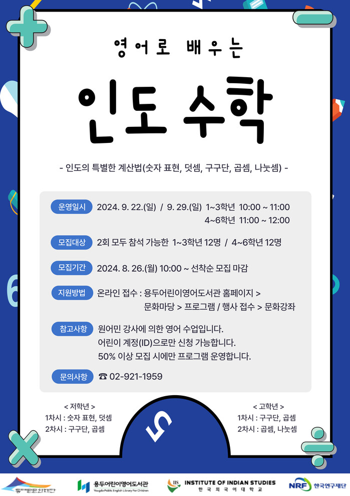 한국외국어대학교 인도연구소 원어민 교수가 진행하는 이번 강좌는 덧셈, 곱셈, 나눗셈 등 기초 연산을 인도의 특별한 계산법인 ‘베다 수학’과 영어로 학습해 볼 수 있는 기회다.