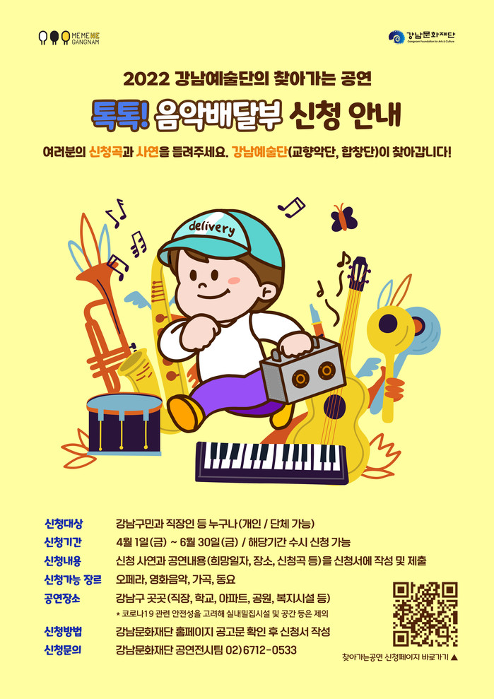 찾아가는 공연 <톡톡! 음악배달부> 신청은 강남문화재단 홈페이지를 통해 가능하며 신청 가능한 곡 장르는 강남예술단의 특성을 살린 오페라, 영화음악, 가곡, 동요 등으로 실현 가능성과 사연, 방역수칙 준수에 적합한 장소 여부 등을 종합적으로 검토 후 진행될 예정이다.